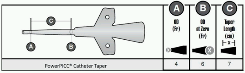 ○完全插入PICC,尽可能接近零厘米标记(在下面的图1的位置B)。这样具有更好的抗扭结效果,同时,锥形区域被利用与较低的导管泄漏率相关。